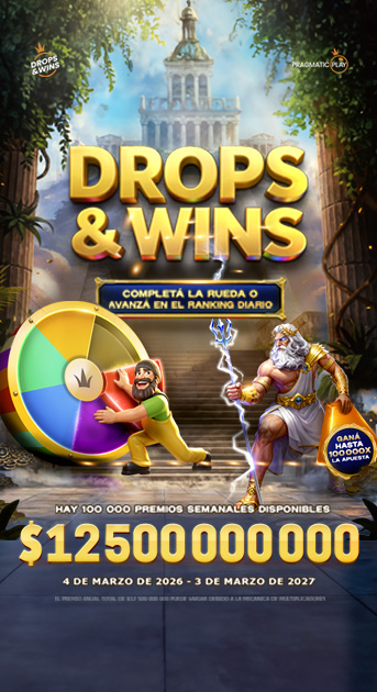 - Los Wheel Drops Semanales de Drops & Wins están disponibles en slots seleccionados, del 4 de marzo de 2026, a las 18:01 GMT+0 (19:01 CET), al 3 de marzo de 2027, a las 17:59 GMT+0 (18:59 CET), de miércoles a miércoles (el “Período Promocional”). Esta es una promoción de la red operada por Pragmatic Play, por lo cual, los premios se repartirán entre los distintos operadores.